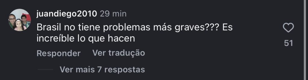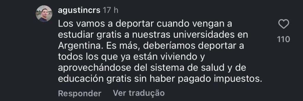 Entre os comentários publicados, usuários sugerem medidas de exclusão: “Vamos deportá-los quando vierem estudar de graça nas nossas universidades na Argentina…”, comenta um argentino em uma reportagem publicada pelo jornal Clarín.