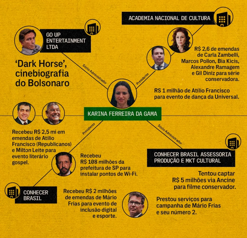 A reportagem destaca ainda a participação da advogada Karina Kufa, ex-tesoureira da campanha de Bolsonaro, que atua como ponte jurídica e institucional em iniciativas associadas à Dark Horse. Segundo o Intercept, Kufa teria intermediado relações entre produtores, empresas tecnológicas e atores políticos, o que amplia o debate sobre possíveis conflitos de interesse e sobre o papel de figuras ligadas ao ex-presidente na articulação de projetos financiados indiretamente pelo poder público.
